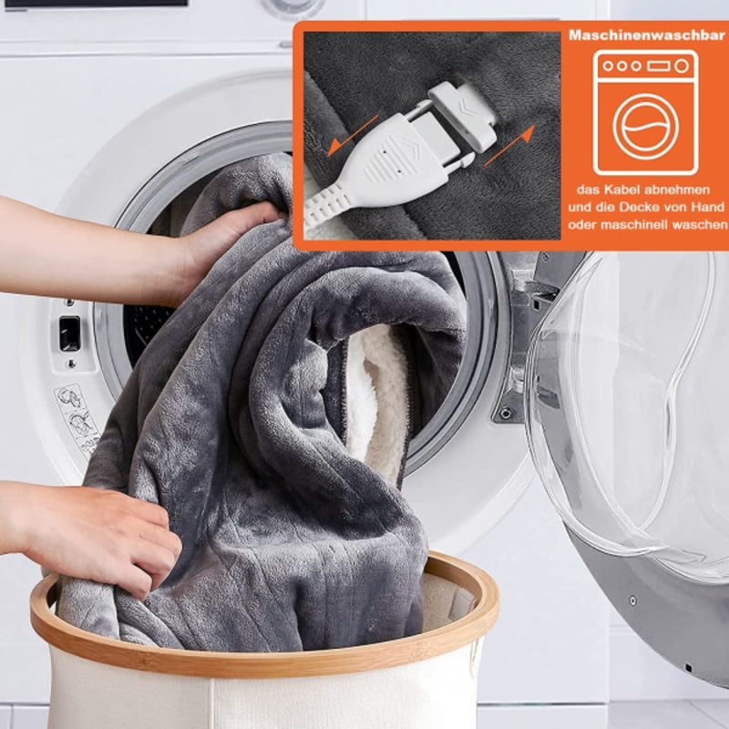 Die Decke hat die Maรe 150x80cm. Das abnehmbare Bedienteil mit drei Leistungsstufen sorgt fรผr bequeme Handhabung. Auto-OFF-Timer: Einstellbar von 1 bis 8 Stunden. Die Decke wird automatisch ausgeschaltet, wenn die Zeit erreicht ist. Die Heizdecke kann (ohne Kabel) in der Maschine gewaschen werden (30ยฐ C, Wollprogramm). Das abnehmbare Stromkabel ist ca. 2 Meter lang. Eingangsspannung 110-220 V Frequenz 50-60 Hz Leistung 100 W